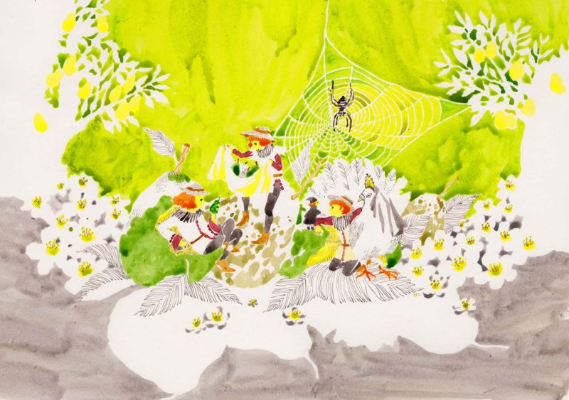 小兎の家まで連れて行かれて結婚だ!結婚だ!と騒がれる。婚礼の式にくるお客にだす青キャベツと黍料理を